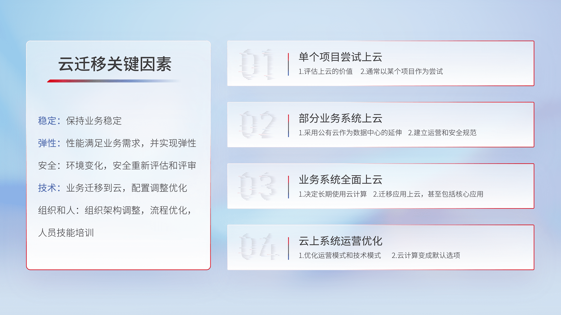 结合实际业务,,,,从规划设计、、云平台选型、、、、云原生改造、、、数据迁移、、、、集成交付,,迁移全过程为客户识别最佳上云路径,,,,做好风险识别管理,,设计网络架构、、、、身份权限、、、安全审计合规、、、、操作审计、、、、日志审计、、、、监控告警策略、、多站点容灾设计等,,,,对云上基础设施进行整体规划,,提升IT治理水平,,以满足弹性、、高可用、、、、高性能的需求。。。